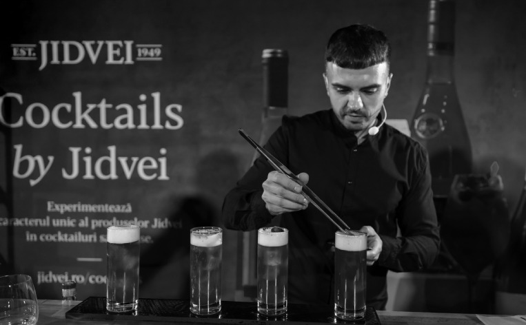 În speed tin se adaugă 40ml Vinars Jidvei VSOP, 20ml cordial de soc cu piper roșu și cimbrișor*, 15ml Verjus Jidvei, 10ml reducție de vin roșu Jidvei Grigorescu Roșu cu gem de căpșuni și cimbrișor**.