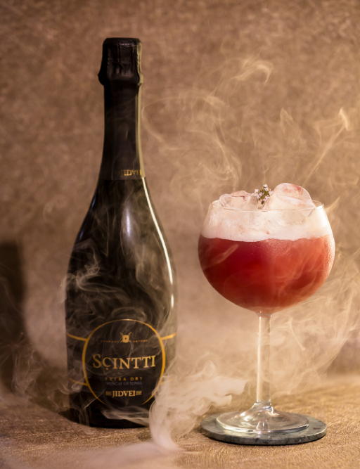 Se adaugă pe rând, 20ml Verjus Jidvei, 30ml reducție de vin roșu Jidvei Grigorescu Roșu*, 100ml spumant Jidvei Scintti Muscat Ottonel, iar cu o linguriță de bar se amestecă compoziția.